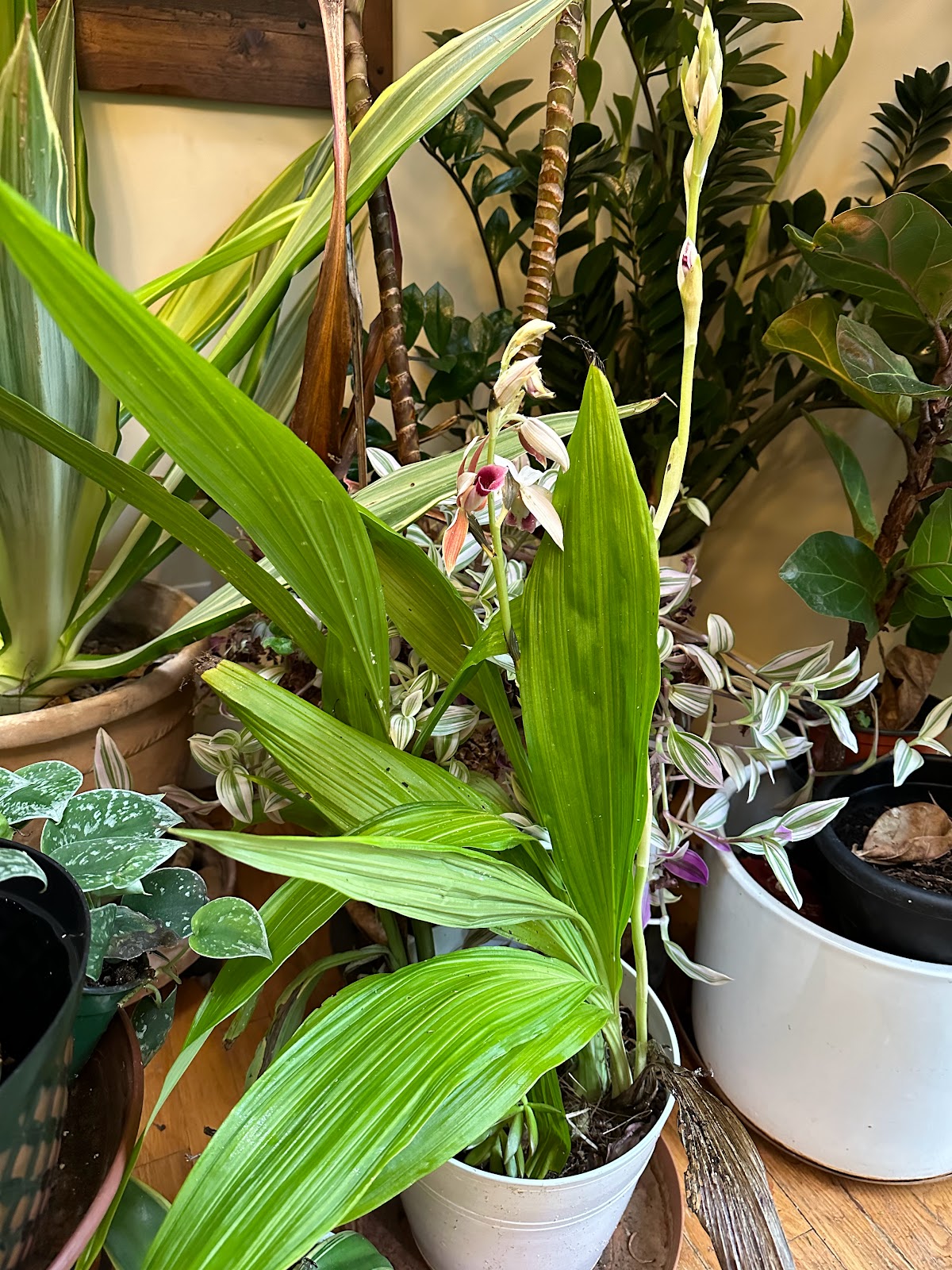 I'm so excited to write that my Nun Orchid is blooming! This is an unusual, but incredibly low maintenance houseplant that blooms once or twice a year (for me typically in the spring!). I believe the common name comes from the orientation of the blooms which look like a nun is praying. The botanical name is Phaius tankervilleae.