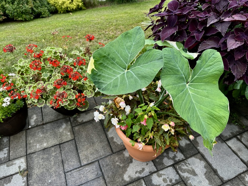 | Plumeria "Inca Gold" is starting to bloom. Musa Sikkimensis is growing a new leaf a week and is getting very full. I love the variegated cordyline here too! |